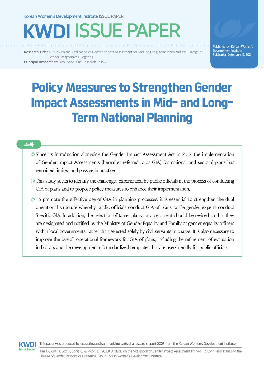 [Issue Paper] Policy Measures to Strengthen Gender Impact Assessments in Mid- and Long-Term National Planning (Dool-Soon Kim) | |