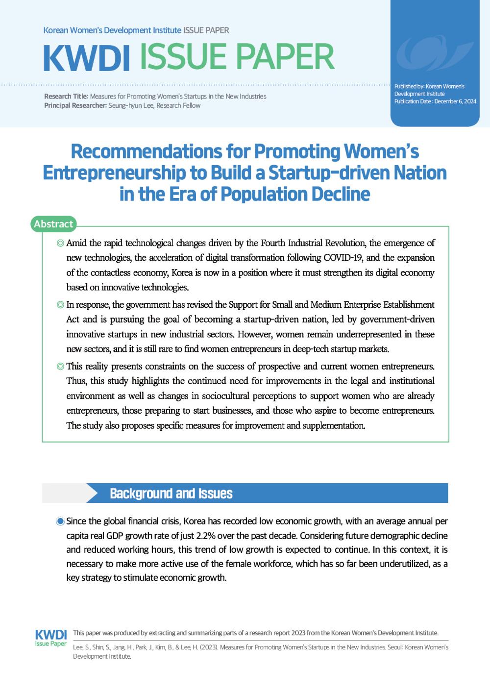 | [Issue Paper] Recommendations for Promoting Women's Entrepreneurship to Build a Startup-driven Nation in the Era of Population Decline (Seung-hyun Lee) | |